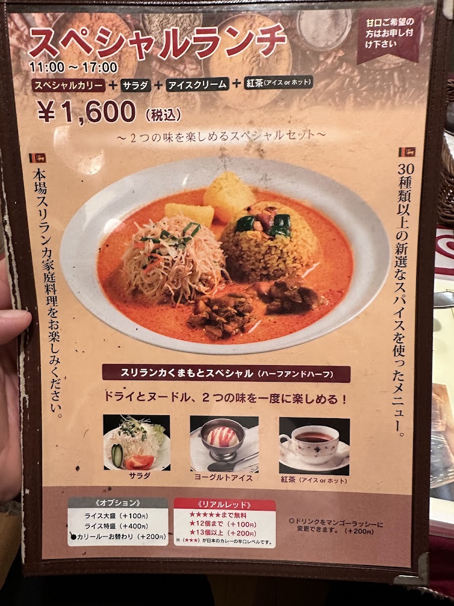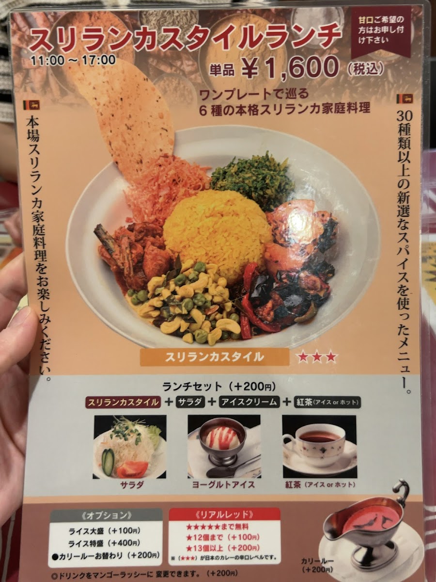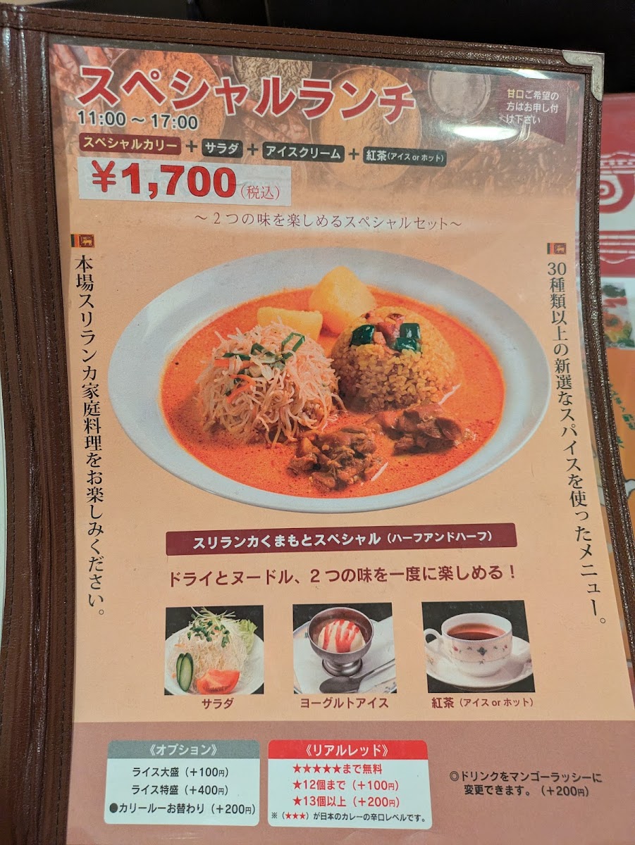 At Sri Lanka Kumamoto, the menu offers a vibrant selection of dishes that transport diners straight to the heart of Sri Lankan flavors. A must-try is the スリランカカレー sri lankan curry, a rich and aromatic dish that captures the essence of Sri Lankan cuisine with its perfectly balanced spices and tender meat. For those looking for a refreshing side, the オリジナルサラダ original salade provides a crisp contrast with its fresh ingredients and light dressing. To cool down after the spice, indulge in the delightful ヨーグルトアイス, a creamy yogurt ice cream that perfectly complements the bold flavors of the main course. The サバコロッケ offers a deliciously crispy texture, with a savory filling of mackerel croquette. For dessert, there's always the classic アイスクリーム, served in a variety of flavors that satisfy every sweet tooth. The オムレツ brings a comforting touch to the menu, with its fluffy texture and savory fillings. To wash it all down, the ライオンラガービール offers a refreshing beer that pairs beautifully with the rich, spicy dishes, while the 紅茶 provides a soothing end to the meal. Each dish on the menu is thoughtfully prepared, offering a perfect balance of flavors that leave a lasting impression on all who visit.